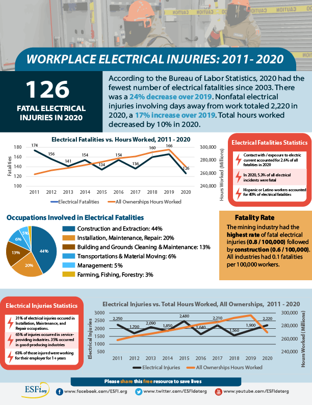 Despite a drop in electrical fatalities, electrical injuries increased by 17% in 2020. By studying how and why workers are getting hurt, ESFI can create new materials to help educate all workers, whether they work regularly with electricity or not, to stay safe on the worksite to prevent these avoidable incidents. For free-to-share materials you can spread throughout your workplace, community, or home, visit esfi.org.