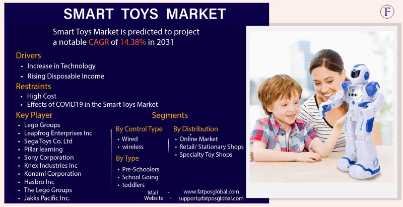 PHILADELPHIA, UNITED STATES, January 10, 2022 /EINPresswire.com/ -- Fatpos Global has released a report titled “Smart Toys Market –Global Analysis of Market Size, Share & Trends for 2020 – 2021 and Forecasts to 2031” which is anticipated to reach USD 41415.66 million by 2031. According to a study by Fatpos Global, Smart Toys Market to surpass USD 41415.66 million by 2031 from USD 10803.17 million in 2021 at a CAGR of 14.38% within the coming years, i.e., 2021-31. Increased use of technology and awareness will fuel industry growth over the next ten years. Increased global technology spending is expected to drive demand over the forecast period. In addition to industry growth, Smart Toys Market penetration is expected to rise above the forecast level. On the other hand, increasing Investment by the major players in new environmentally friendly techniques to produce Smart Toys will create more opportunities that will result in the growth of the Smart Toys Market over the forecast“Increase in the number of internet handlers additionally with the growing acceptance of numerous hand-held devices such as laptops, smartphones, and tablets together is driving the awareness and growth of smart toys market globally. It also helps students to study while playing and boost the growth of essential skills like creativity, imagination, problem-solving, and thinking outside the box”, said a lead analyst at Fatpos Global.