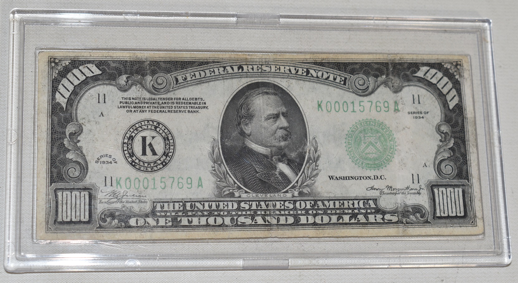 More from the coins category will include a 1798 Flowing Hair silver dollar; a rare 1890 proof struck Indian head penny, graded PF-65; a 1909 VDB Lincoln cent, graded MS-64; a lot of two Morgan silver dollars (an 1878-S 7 Tail Feathers dollar and a 1921-P dollar); nice collections of V.A.M. and Carson City silver dollars; and $1,000 and $500 Federal Reserve paper notes, 1934.