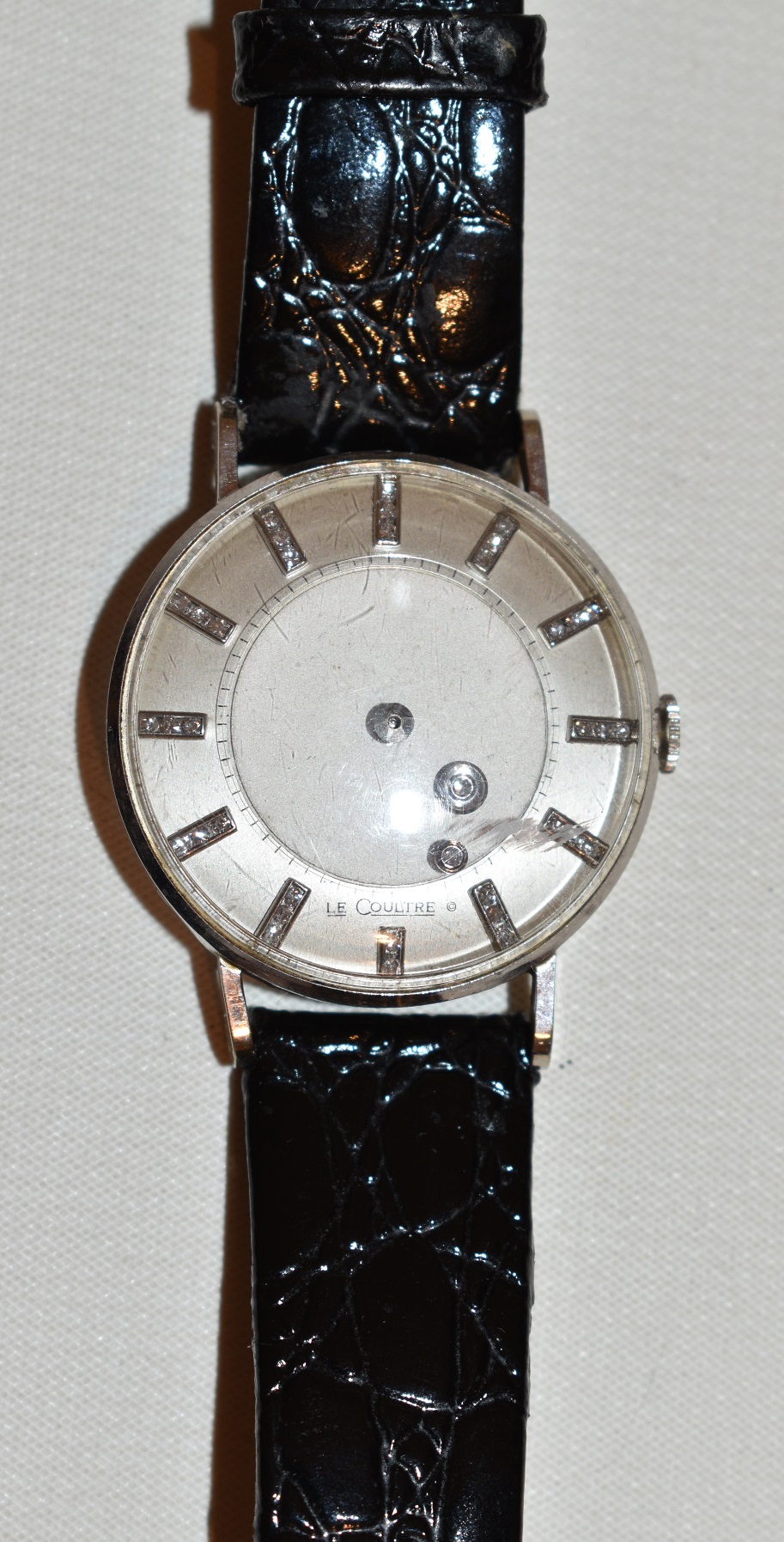 Circa 1960 LeCoultre 14kt white gold diamond mystery dial unisex wristwatch, signed Vacheron & Constantin.