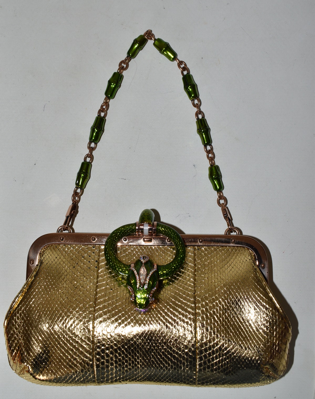 Rare and unusual circa 1984 Gucci evening bag with enameled crystal snake head clasp and original invoice to the previous owner with Gucci papers.