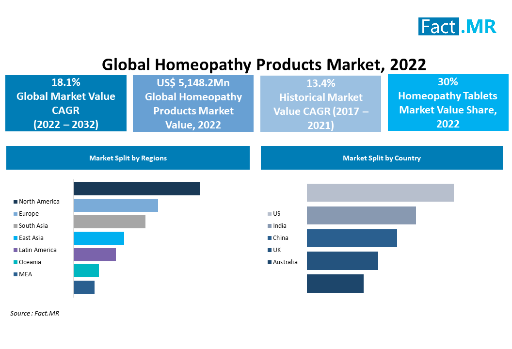 ROCKVILLE, MARYLAND, UNITED STATES, January 11, 2022 /EINPresswire.com/ -- The global homeopathy products market is estimated at USD 5,148 Mn in 2022 and is projected to reach USD 27,173 Mn by 2032, growing at a CAGR of 18.1% from 2022 to 2032.The latest industry analysis and survey on Homeopathy Products provides sales outlook in 20+ countries, across key categories. Insights and outlook on Homeopathy Products market drivers, trends, and influencing factors are also included in the study.