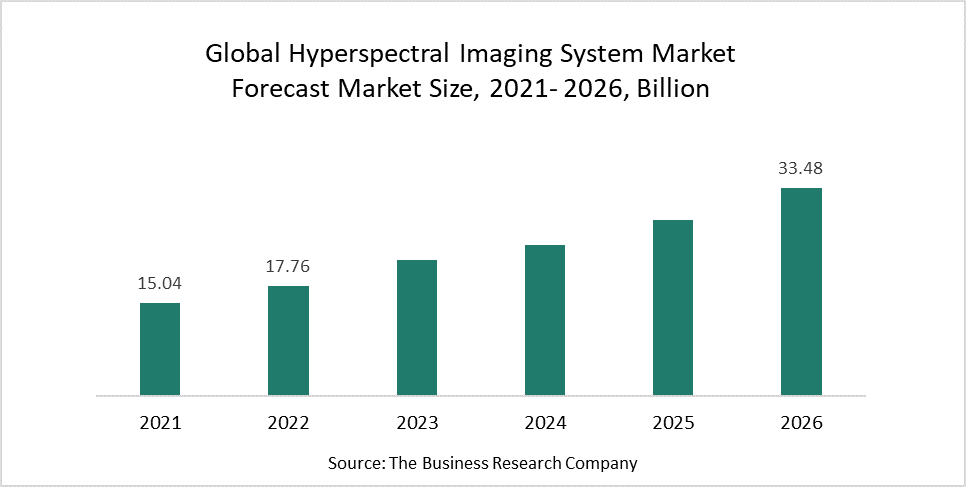 The global hyperspectral imaging system market size is expected to grow from $15.04 billion in 2021 to $17.76 billion in 2022 at a compound annual growth rate (CAGR) of 18.1%. The change in the market growth trend is mainly due to the companies stabilizing their output after catering to the demand that grew exponentially during the COVID-19 pandemic in 2020. The global hyperspectral imaging system market is expected to reach $33.48 billion in 2026 at a CAGR of 17.2%.