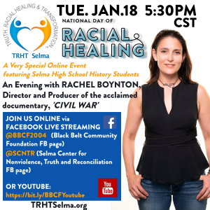 TRHT Selma invites the public to join the special online virtual program beginning at 5:30PM CST on Tuesday, January 18th by visiting either the BBCF Facebook or SCNTR Facebook pages for a livestream broadcast. Viewers can also tune in via the BBCF’s YouTube Channel. TRHT Selma leadership will be joined by Selma City High School History students and their teacher to talk with internationally acclaimed producer and director, Rachel Boynton, about her latest documentary – Civil War (or, Who Do We Think We Are). The film, released in 2021, explores how Americans learn about Civil War history in classrooms around the country. Interviewing historians, high school history teachers, and students, Boynton attempts to highlight how we talk about and teach our Civil War past. Rachel Boynton produced and directed the feature-length documentaries Big Men (2014) and Our Brand Is Crisis (2006). Viewers for Tuesday night’s online event will have the opportunity to comment or pose questions through the comments/chat areas on all platforms.
