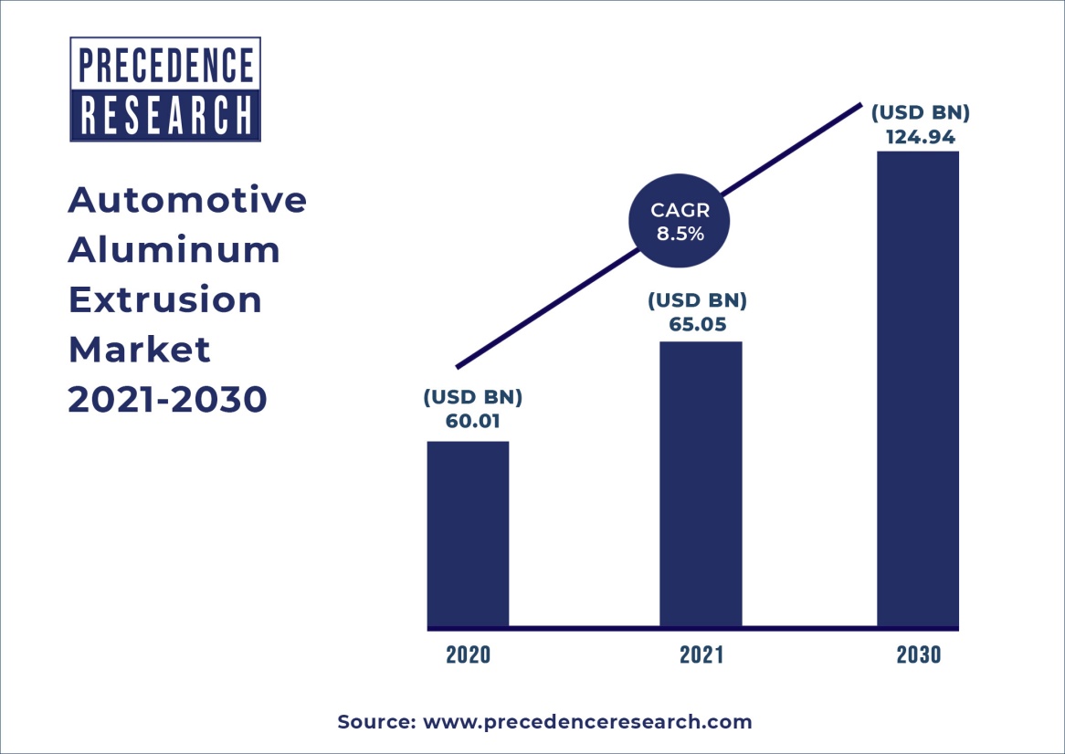 Tokyo, Jan. 12, 2022 (GLOBE NEWSWIRE) -- According to Precedence Research, the automotive aluminum extrusion market size was worth at US$ 65.05 billion in 2021. The automotive aluminum extrusion demand is expected to increase as a result of increasing demand for light weight vehicles and electric vehicles in the market. In order to new alloy processing technologies for lightweight applications, companies in the automotive aluminum extrusion industry need to ramp up their research and development activities.