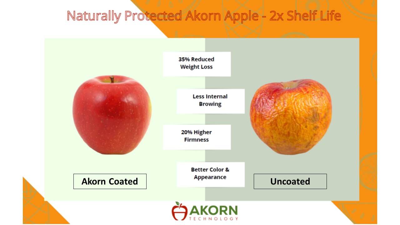 OAKLAND, CA, UNITED STATES, January 26, 2022 /EINPresswire.com/ -- Akorn Technology is pleased to announce the commercial launch of its edible coatings for fresh produce in the US. Following this launch, leading US-based growers and packers of fresh apples and pears will be able to make use of Akorn’s all-natural edible coatings made from upcycled plant and vegetable by-products. Akorn-coated fruit is already available at a number of major retailers in the US.Akorn’s smart and multi-functional edible food coatings double the shelf life of most fruits and vegetables, reduce cold chain losses by 30% or more and deliver produce with better flavor, texture and appearance. Additionally, third party evaluations have conclusively demonstrated that Akorn coatings reduce rot and mold by as much as 50% and are highly effective against pathogenic bacteria that are sometimes found on fresh produce.
