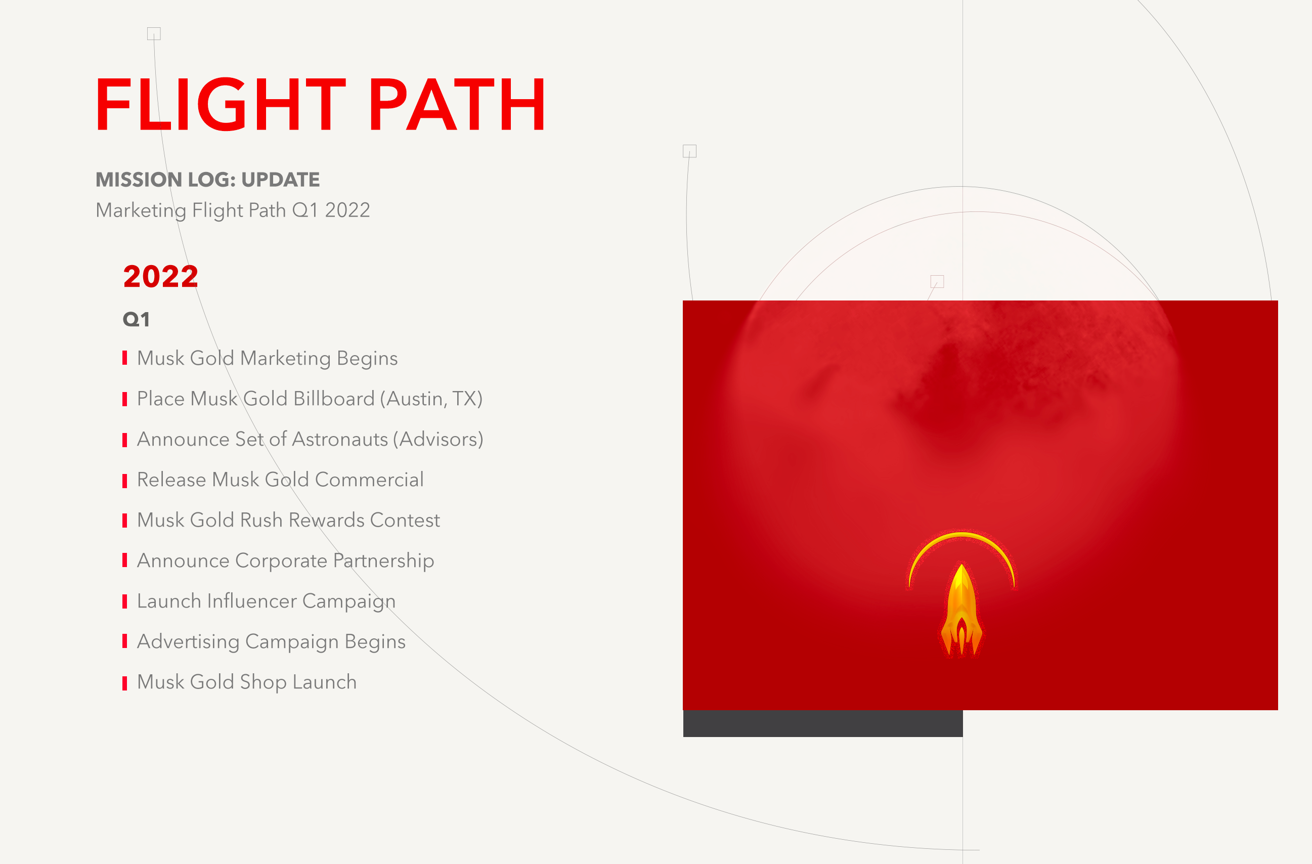 In addition to the Astronaut reveals, Musk Gold released their Q1 2022 Flight Path with new mission log updates. Their Marketing Campaign kicked off by placing a 50 foot, bright red Musk Gold billboard in Austin, Texas, for the entire month of January. Later this week they will release their first branded commercial, with a substantial PR push and advertising spend behind it. They will also launch their first Community based rewards contest in the "Musk Gold Rush", and begin activating celebrities and influencers. Lastly, Musk Gold will open the Musk Gold Shop with products and merchandise inspired by Elon Musk himself - products designed to survive on earth and in space.