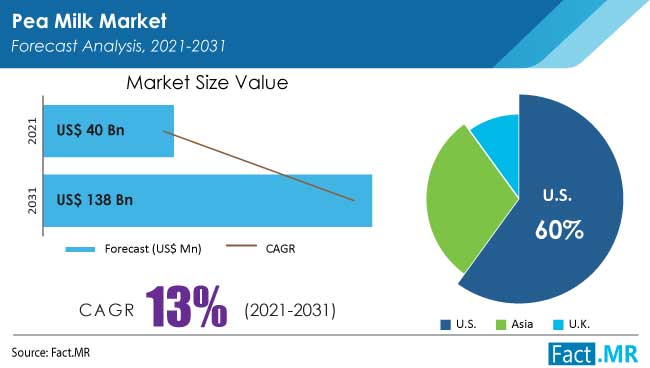 From 2021 to 2031, the Chocolate Flavour Pea Milk market is likely to surge at a 13% CAGR to reach US$ 138 Mn