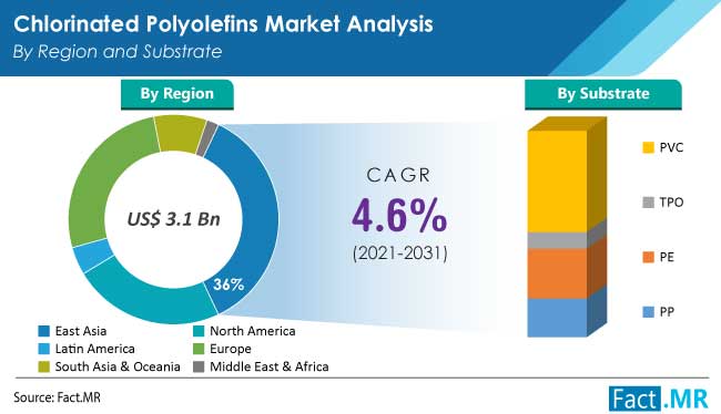 ROCKVILLE, MARYLAND, UNITED STATES, January 20, 2022 /EINPresswire.com/ -- Global chlorinated polyolefins market is anticipated to rise at a CAGR of 4.6%, thereby topping a valuation of US$ 4.9 Bn by 2031. Currently, chlorinated polyolefins account for around 1.2% of overall polyolefins industry share. On the back of recognition as an advanced polymer and active component in adhesion promoter primers, total chlorinated polyolefins consumption is set to reach 1.8 MMT by the end of 2031.Chlorinated polyolefins demand growth is mainly attributed to escalating consumption in a wide range of end uses such as paints & coatings, pipes & fittings, printing inks, adhesives, and much more. Of the prominent substrates, chlorinated PVC (CPVC) sales are expected to dominate as compared to other substrates (PP, PE, TPO, etc.), accounting for around 50% of total consumption by 2031.