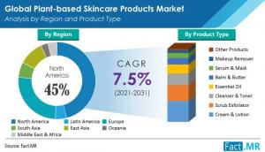 ROCKVILLE, MARYLAND, UNITED STATES, January 20, 2022 /EINPresswire.com/ -- Demand for plant-based skincare products is expected to reach a value of US$ 683.4 Mn in 2021. As per Fact.MR, overall plant-based skincare products market value is expected to increase more than 2X by 2031, rising at a CAGR of 7.5% over the said period. Even though online sales of plant-based skincare products account for just over 11%, this segment is slated to surge at around 10% CAGR through 2031.Base Year Value (2020A) US$ 640 Mn