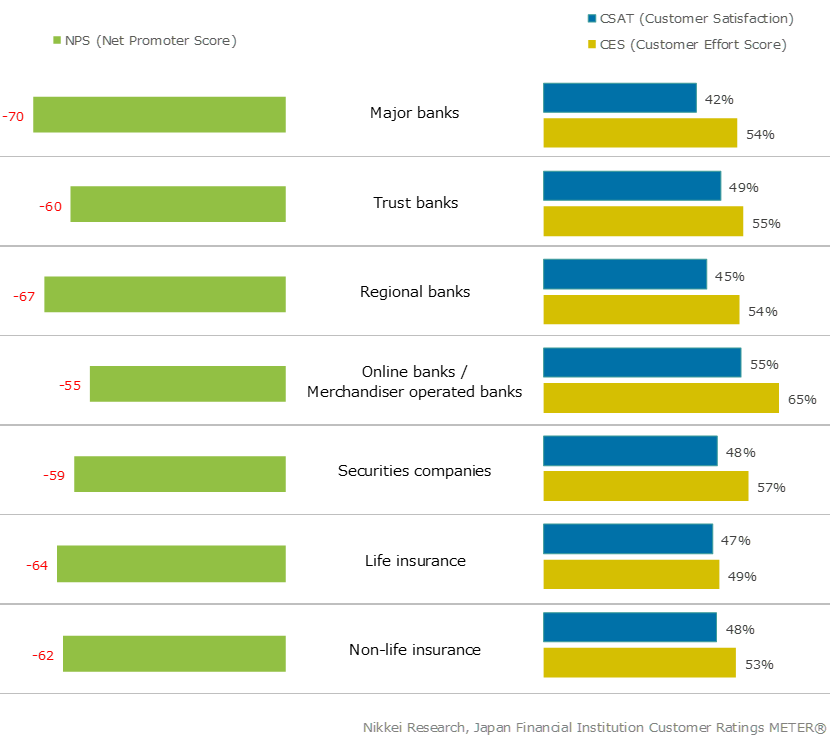 TOKYO, JAPAN, January 31, 2022 /EINPresswire.com/ -- In the latest version of Nikkei Research’s Japan Financial Institution Customer Ratings METER®, 150 financial institutions in Japan were evaluated by a total of 160,000 people throughout the country.The institutions that were the subjects of this survey included major banks, regional bank, trust banks, securities companies, life insurance companies, and non-life insurance companies in Japan. Several metrics were used to evaluate them, such as CSAT (Customer Satisfaction), CES (Customer Effort Score), and NPS (Net Promoter Score).