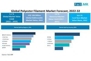 ROCKVILLE, MARYLAND, UNITED STATES, January 24, 2022 /EINPresswire.com/ -- The global polyester filament market is estimated at USD 106 billion in 2022 and is forecast to reach USD 174.7 billion by 2032, growing at a CAGR of 5.1% from 2022 to 2032.The Fact.MR new report on the market survey of Polyester Filament gives estimations of the Size of Polyester Filament Market and the overall Polyester Filament Market share of key regional segments During Forecast Period.