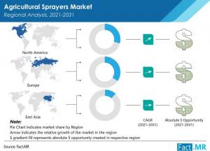 ROCKVILLE, MARYLAND, UNITED STATES, January 24, 2022 /EINPresswire.com/ -- The global agricultural sprayers market was valued at around US$ 1.8 Bn in 2020, which amounts to close to 1.6% share of the overall agricultural equipment market. Sales of agricultural sprayers are projected to accelerate at a healthy CAGR of 6% to top US$ 3.2 Bn by 2031.Demand for battery-operated agricultural sprayers is set to increase steadily at a CAGR of 4% across the assessment period of 2021 to 2031. Latest trends of agricultural sprayers and technological advancements in agricultural sprayers will pave the way for increased opportunities for market layers over the next ten years.