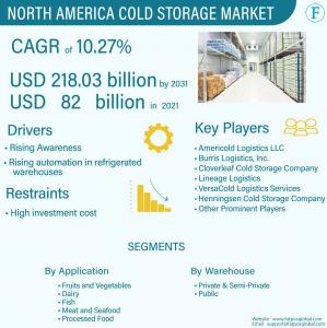 PHILADELPHIA, UNITED STATES , January 25, 2022 /EINPresswire.com/ -- Fatpos Global has released a report titled “North America cold storage Market - Analysis of Market Size, Share & Trends for 2014 – 2020 and Forecasts to 2031” which is anticipated to reach USD 218.03 billion by 2031. According to a study by Fatpos Global, the market is anticipated to portray a CAGR of 10.27% between 2021 and 2031. According to the report, the growing penetration of connected devices and the existence of a many consumers base are the key trends accelerating market growth. Additionally, the growing automation of refrigerated warehouses is anticipated to improve the demand for the product. Automation in warehouses is attained with the application of cloud technology, conveyor belts, robots, energy management systems, and truck loading automation. Integration of workforce management solutions for picking optimization & workforce forecast has led to reduced labor costs.