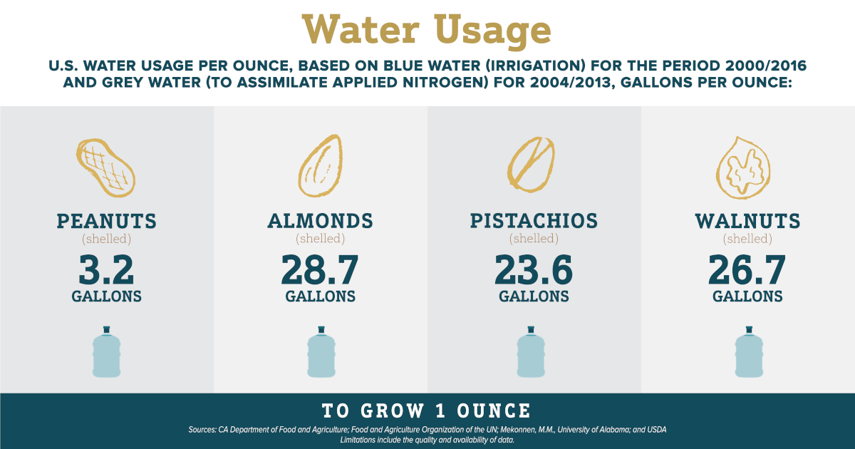 Newly released data reports that 3.2 gallons of water is used to produce one ounce of shelled peanuts. Water usage for major tree nuts has also improved but remains higher than peanuts. Almonds use 28.7 gallons; pistachios use 23.6 gallons; and walnuts use 26.7 gallons of water to grow a one ounce serving.*