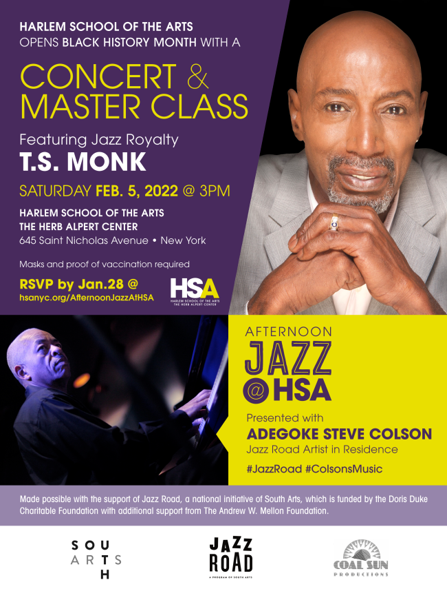 The Afternoon Jazz @ HSA series will kick off on Saturday, February 5, in honor of Black History Month with T.S. Monk, son of revolutionary jazz pianist, Thelonious Monk. T.S., who performed in his father’s band, is a decorated drummer, bandleader in his own right, and founder of Thelonious Monk Institute of Jazz. On March 19, in celebration of Women’s History Month, the Marlene Rice String Three-Tet, led by innovative musical artist, violinist, vocalist, arranger, songwriter Marlene Rice , and including the indefinable cellist Nioka Workman, will hold court. In tribute to Jazz Appreciation Month, Adegoke Steve Colson will take center stage on April 30 with a quintet featuring acclaimed vocalist/composer Iqua Colson, renowned drummer Pheeroan akLaff, fiery Saxophonist TK Blue who served as Randy Weston’s musical director, and innovative bassist Luke Stewart, who was named one of the 25 most influential jazz artists of his generation by Downbeat Magazine. These events will all be open to students, families, and the community.