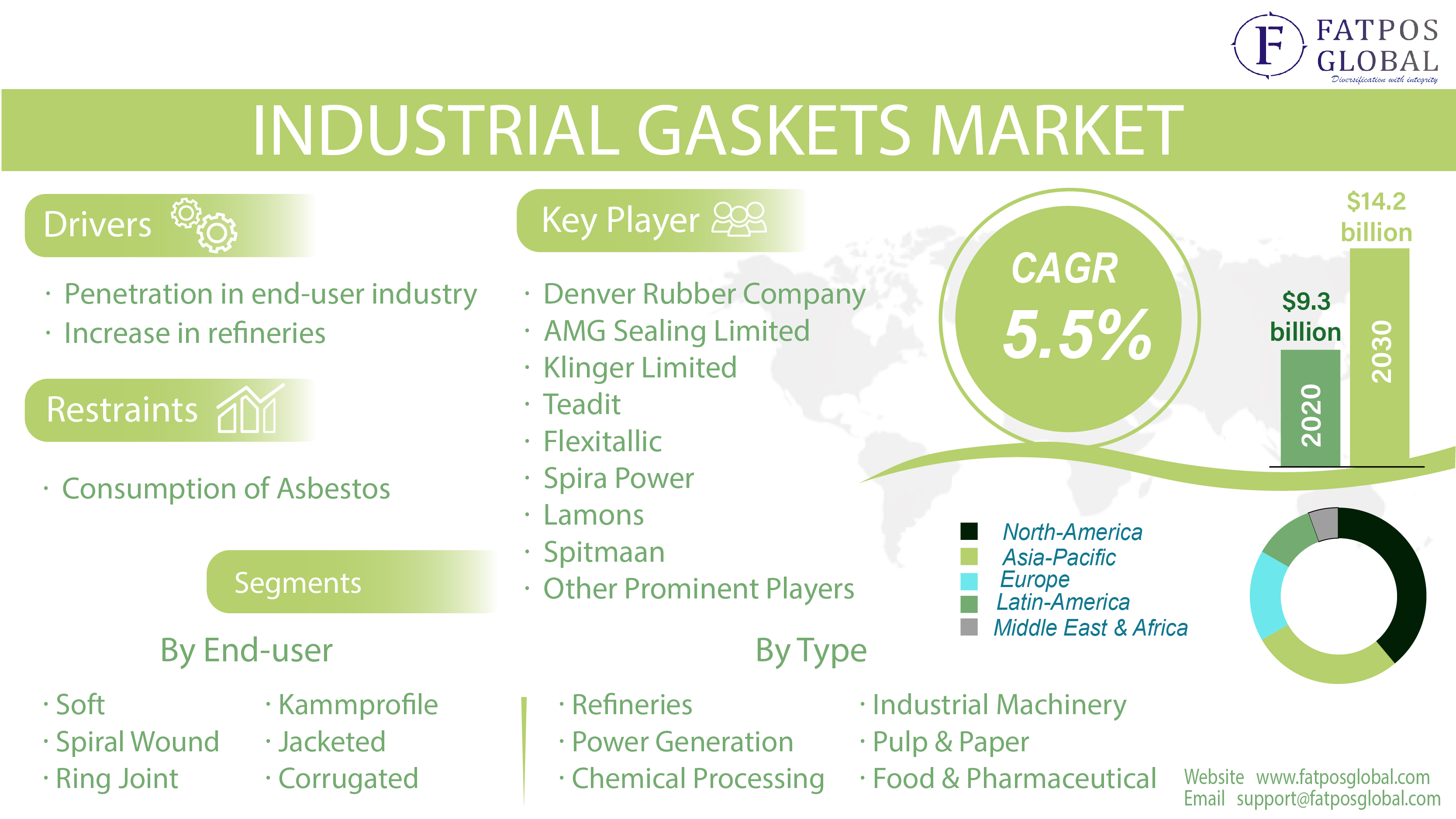PHILADELPHIA, UNITED STATES , January 31, 2022 /EINPresswire.com/ -- Fatpos Global has released a report titled “Industrial gaskets Market - Analysis of Market Size, Share & Trends for 2014 – 2020 and Forecasts to 2030” which is expected to reach USD 67.2 billion by 2030. According to a study by Fatpos Global, the market is anticipated to portray a CAGR of 6.1% between 2020 and 2030. According to the report, gaskets, such as petrochemical, electricity generation, chemical, pulp, and paper, are widely used by process industries to avoid liquid and gas leakages. In those industries, demand for industrial gaskets increases results in a greater chemical, alkaline, acid, and other resistance; high-temperature resistance; resistance to intense pressure; resistance to various climates and other conditions. During the projected period, the increasing number of refineries in the developing countries will increase demand for industrial gaskets.“Industrial gaskets, such as petrochemical, electricity generation, chemical, pulp, and paper, are widely used by process industries to avoid liquid and gas leakages. In those industries, demand for industrial gaskets increases results in a greater chemical, alkaline, acid, and other resistance; high-temperature resistance; resistance to intense pressure; resistance to various climates and other conditions. During the projected period, the increasing number of refineries in the developing countries will increase demand for industrial gaskets”, said a lead analyst at Fatpos Global.