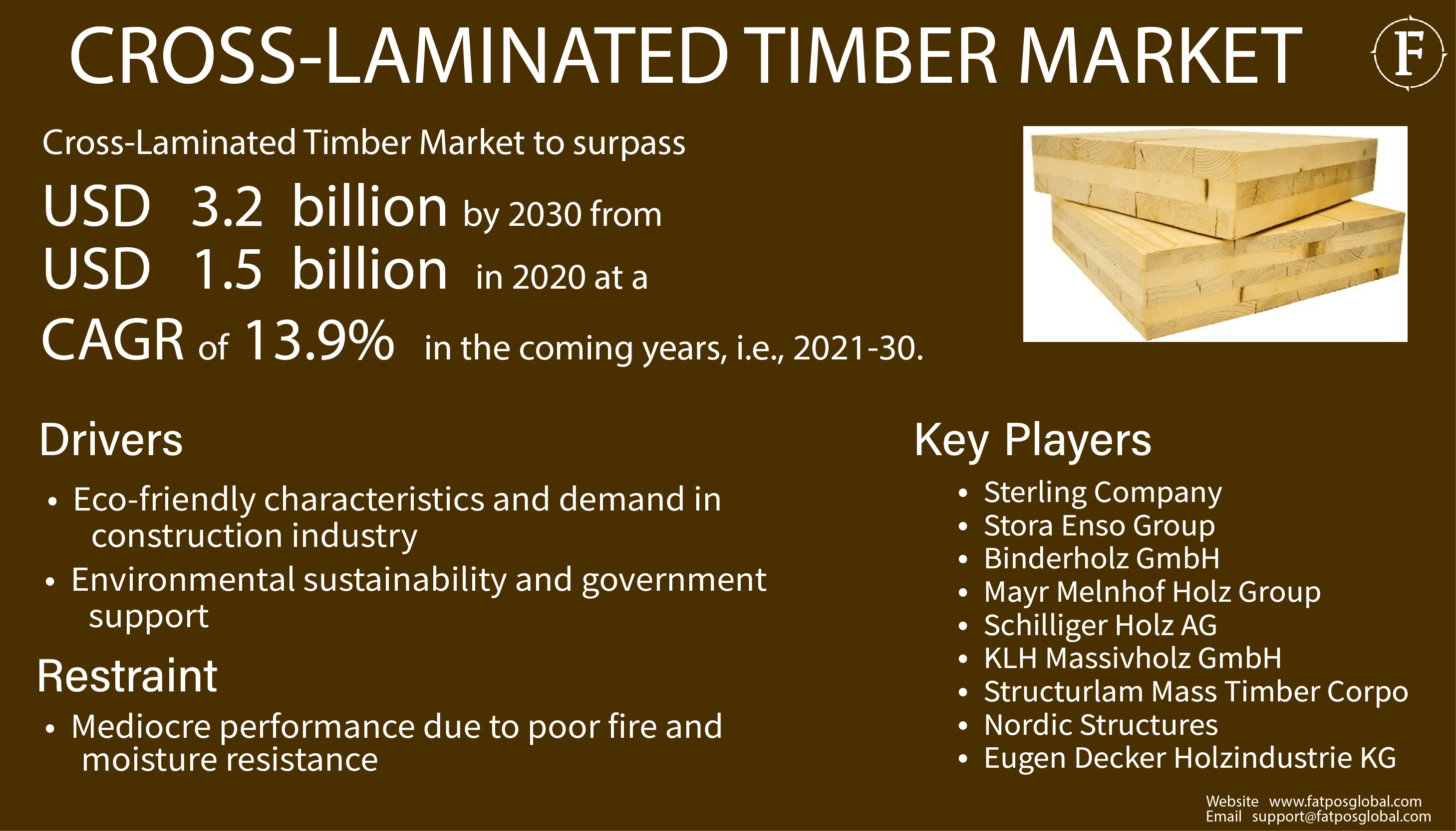 PHILADELPHIA, UNITED STATE, February 2, 2022 /EINPresswire.com/ -- Fatpos Global has released a report titled “Cross-Laminated Timber Market - Analysis of Market Size, Share & Trends for 2014 – 2020 and Forecasts to 2030” which is anticipated to reach USD 3.2 billion by 2030. According to a study by Fatpos Global, the market is anticipated to portray a CAGR of 13.9% between 2020 and 2030. According to the report, Manufacturers' preference for steel and concrete over traditional building materials is one of these considerations. In addition, due to its lightweight and dimensional stability, performance durability, and other characteristics, this Timber is favored over steel and concrete. Furthermore, people's lifestyles are changing, resulting in increased purchasing power. As people's lifestyles change, their per capita income rises, and more people buy homes, which increases the market growth.
