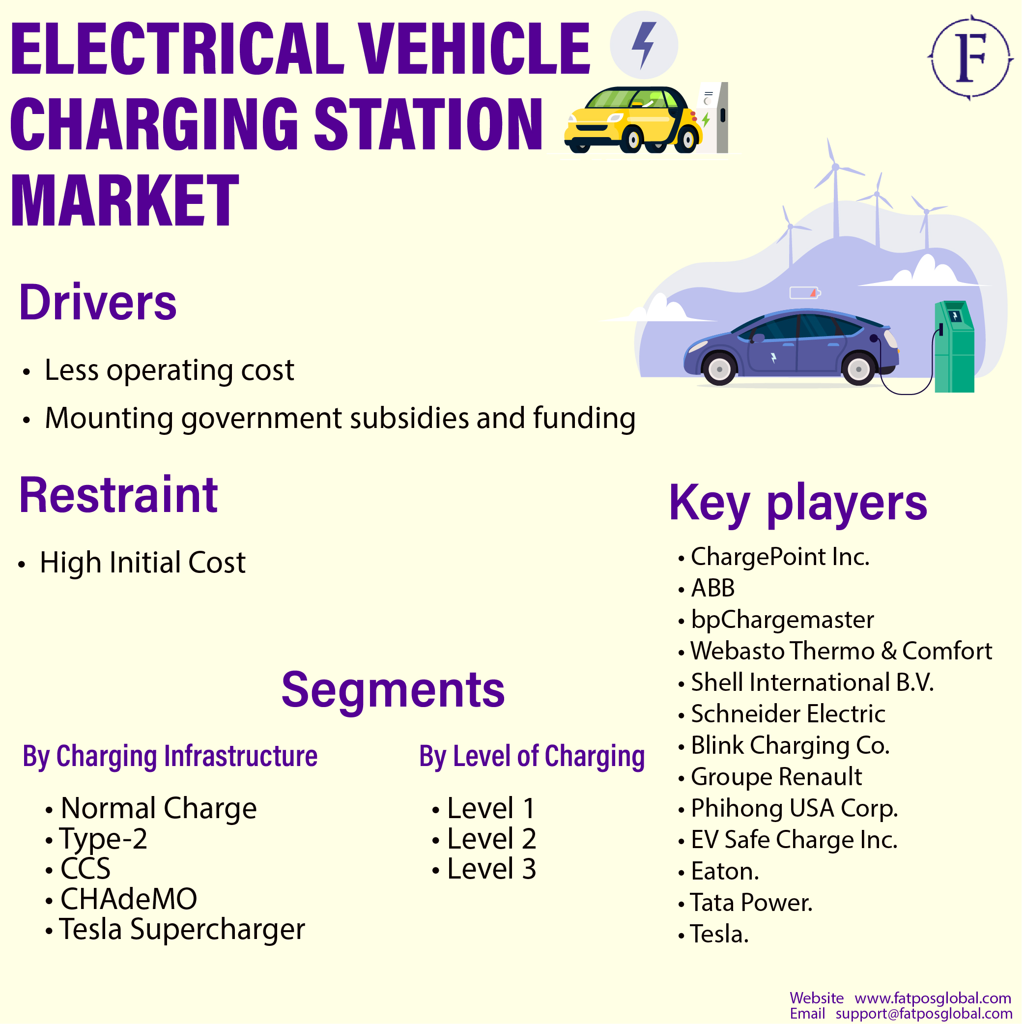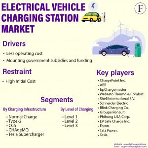 PHILADELPHIA, UNITED STATE, February 2, 2022 /EINPresswire.com/ -- Fatpos Global has released a report titled “Electrical Vehicle Charging Station Market - Analysis of Market Size, Share & Trends for 2019 – 2020 and Forecasts to 2030” which is anticipated to reach USD 248.26 billion by 2030. According to a study by Fatpos Global, the market is anticipated to portray a CAGR of 23.48% between 2020 and 2030. According to the report, electric vehicles have a lower long-term running cost than gasoline or diesel cars, which is propelling the demand for electric vehicles. Another significant driving factor for the growth of the market is the potential market of offering charging services to EV fleet operators. It aids in lowering the cost of handling and procuring charging services. In addition, rising demand for energy-efficient commuting, governments supporting electric vehicles is fueling the market growth.