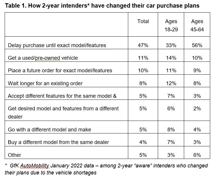 NEW YORK, NY, UNITED STATES, February 3, 2022 /EINPresswire.com/ -- As worldwide chip shortages continue to disrupt auto business models and consumer purchase plans, many car buyers are saying they will wait months or even a year or more to get exactly the model and features they had been hoping to buy.Among those who plan to buy or lease a car in the next two years (“two-year intenders”), roughly three-quarters (72%) say they are aware of the current vehicle shortages. Almost half (45%) of these “aware intenders” say that the out-of-stocks have led them to change their auto purchase plans, according to the latest data from GfK AutoMobility™. And 47% of these would-be buyers report that they will delay their purchases until the exact model and features they had selected becomes available at the dealer.
