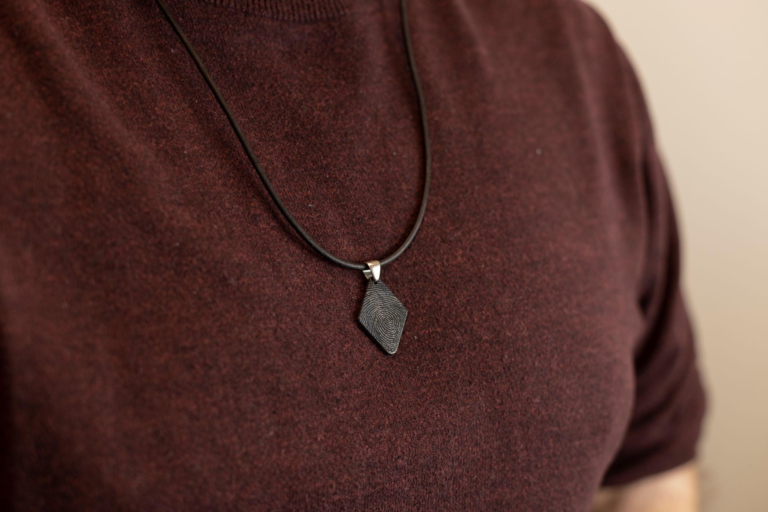 The ceramic blend is sculpted into individual pieces using extreme heat and pressure to form three shapes: Diamond, Bar, and Rectangle. The mold hardens into an incredibly smooth and durable pendant with a jet-black color.