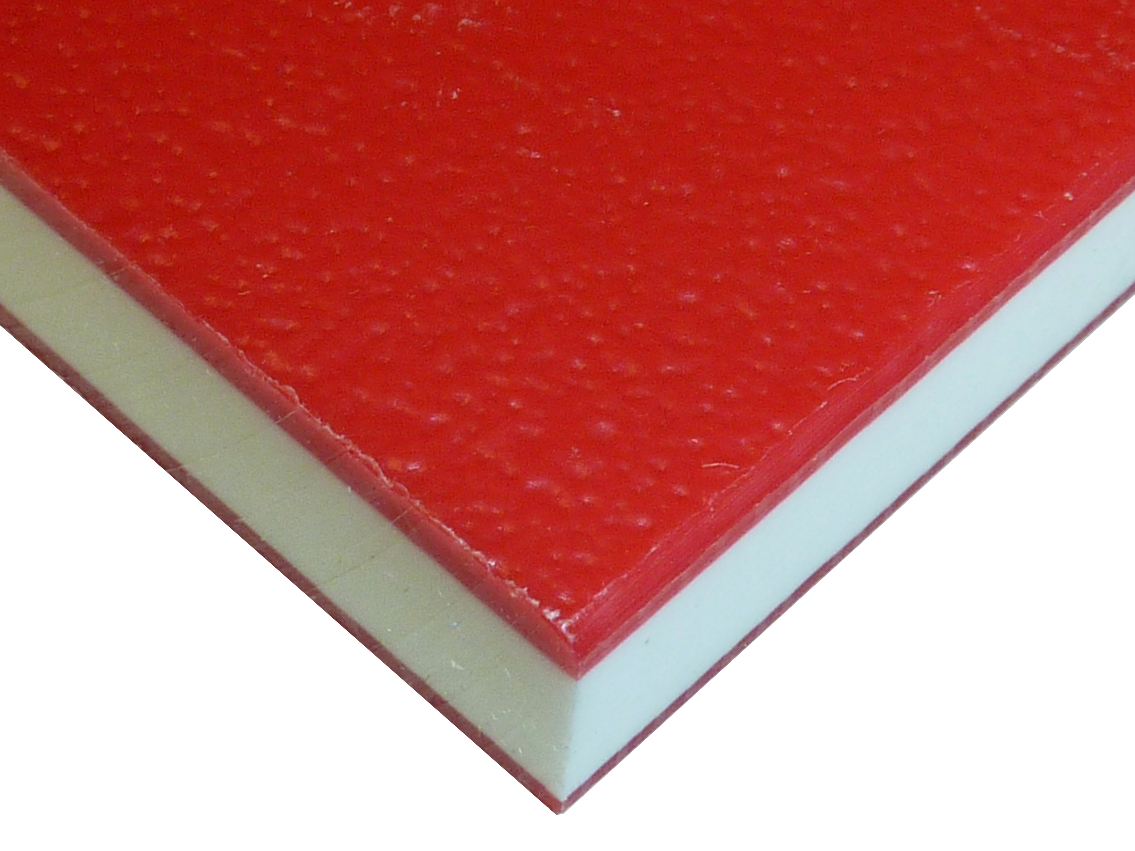 HDPE ColorCore® is manufactured using a state-of-the-art proprietary process where various layers of color are fused into a single homogeneous sheet. The result is a material with two thin cap layers on both sides and a primary color serving as the core on the inside. This colored core makes up roughly 80% of the thickness of the sheet, while the outside cap layers are 10% on both sides. Due to the thinness of the cap layers, ColorCore® is easy to machine and engrave using standard woodworking tools.