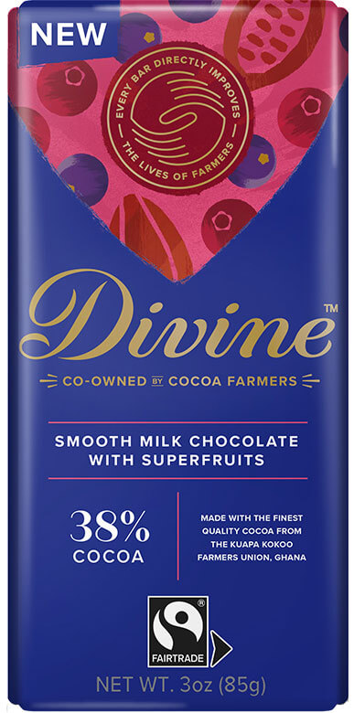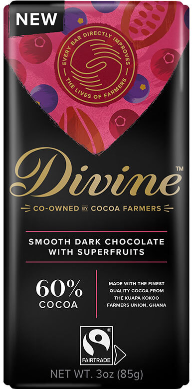 Available in both 60% Smooth Dark Chocolate and 38% Creamy Milk Chocolate varieties, the Superfruits bars represent the first time the company has created a three-flavor bar and are the only mass-market chocolate manufacturer with this unique flavor profile. The combination of the berries and warm vanilla delivers a harmonious experience for both milk and dark chocolate lovers. Divine’s creamy milk chocolate balances the sourness of the berries while its dark chocolate offsets the sourness, offering a softer taste experience.