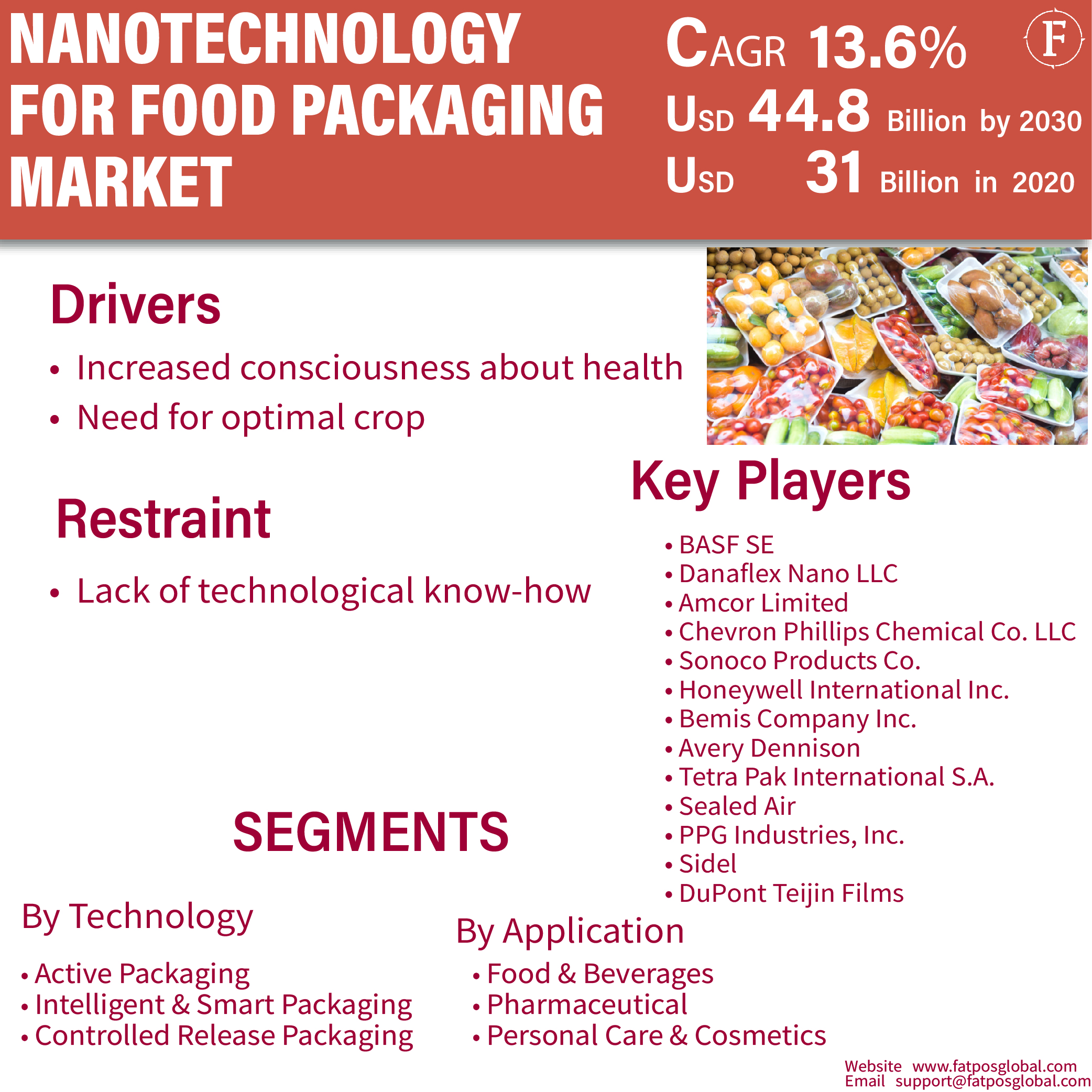 PHILADELPHIA, UNITED STATES , February 10, 2022 /EINPresswire.com/ -- Fatpos Global has released a report titled “Nanotechnology for Food Packaging Market - Analysis of Market Size, Share & Trends for 2019 – 2020 and Forecasts to 2030” which is anticipated to reach USD 44.8 billion by 2030. According to a study by Fatpos Global, the market is anticipated to portray a CAGR of 13.6% between 2020 and 2030. According to the report, the Increased population demand for food is increasing. This is one of the main reasons for the need for agricultural productivity improvement techniques. Nano-products such as nano fertilizers and nano-pesticides in agriculture are focused on reducing chemical propagation, limiting nutritional losses in fertilizer, and enhancing yields by pesticide management and nutrient management. Therefore nanotechnology can be improved with new nanotools in agriculture. The increasing need for optimal crop production with scarce funds gives it tremendous popularity among farmers.