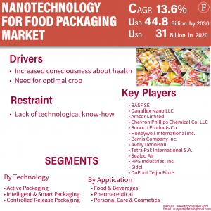 Nanotechnology for Food Packaging Market to surpass USD 44.8 billion by 2030 from USD 31 billion in 2020 at a CAGR of 13.6 % in the coming years, i.e., 2021-30.