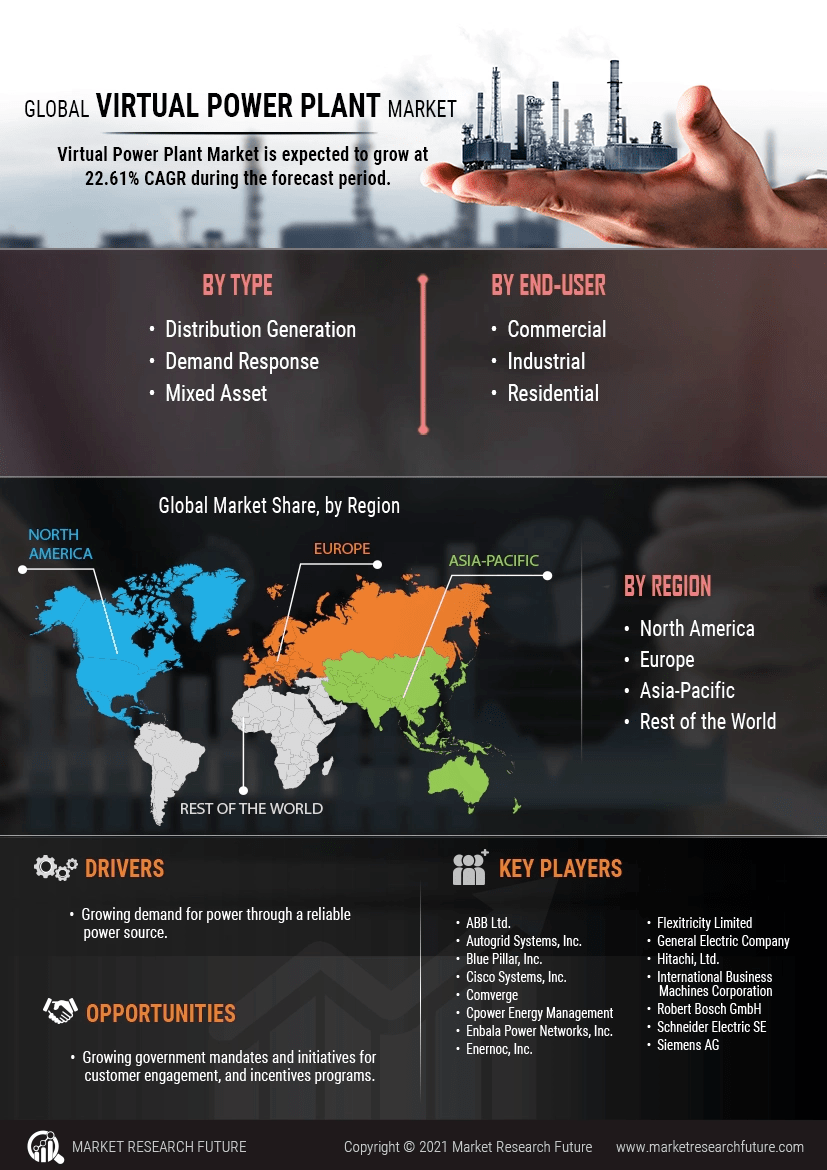 The growth of virtual power plant market is driven by various factors in regions, across the globe. The major factor boosting the market growth is the growing demand for power through a reliable power source is expected to drive the global industry over the forecast period. Virtual power plant helps in delivering energy peak usage times and the end-users can save up the excess energy in the energy storage devices such as batteries. Also the growing government mandates and initiatives for customer engagement, and incentives programs might prove to be an added boost for the end-user segment. The global rise in the demand for non-conventional energy in the power generation sector, changes in dynamics of power grids from centralized to distributed, and regulating costs and easy convenience of energy storage drive the development of the virtual power plant market. The phenomenal growth in the construction industry, exclusively in the Asia Pacific region is expected to propel the overall virtual power plant market during the forecast period.