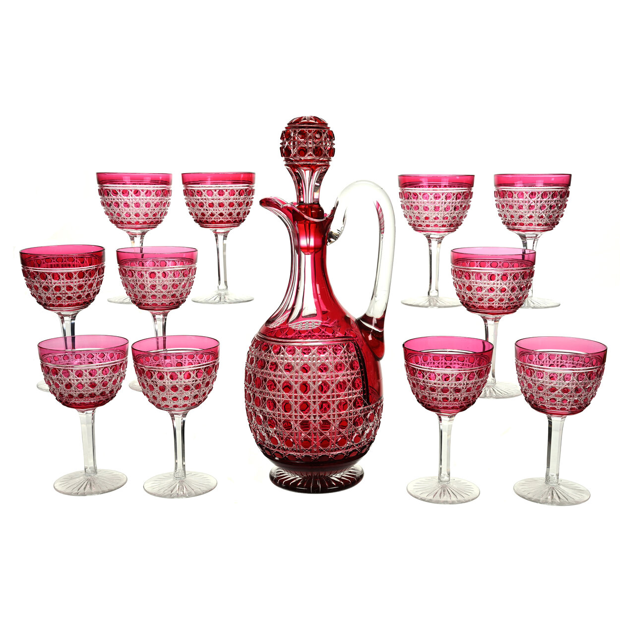 Brilliant Period Cut Glass red cut to clear set in the Cane pattern fluorescing under a black light to indicate it’s American, with a pattern cut stopper and selling with ten matching wine stems.