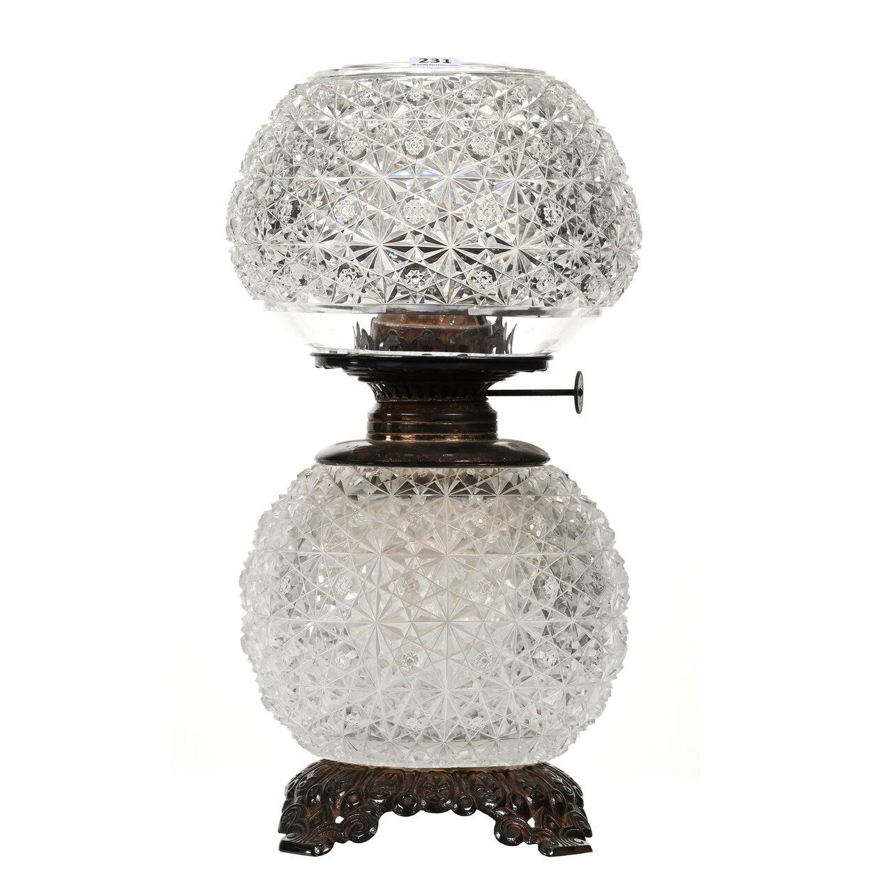 American Brilliant Cut Glass oil lamp in the Persian pattern, 13 ½ inches tall, with no chimney, removable oil font and a mounted metal base.