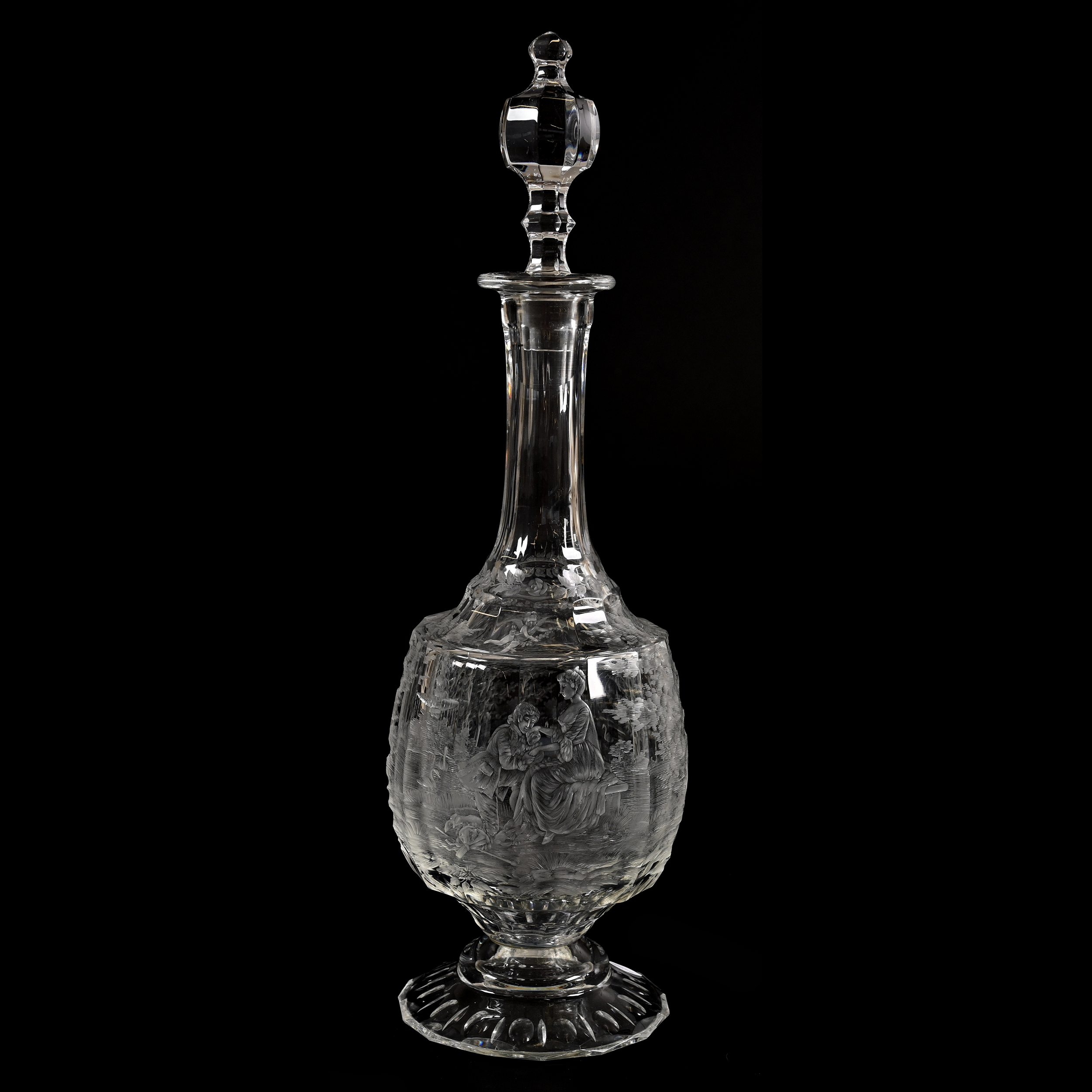 Also offered will be a BPCG Moser pedestal decanter, 15 ¾ inches tall, with flawless engraved cutting featuring a courting man and woman near a fountain and lake with swan and tree highlights, artist marked “RS”; and a set of six BPCG cranberry cut to clear wine stems, 5 ¼ inches tall, each having interlocking rings with hobstar and cane highlights, a diamond cut border and colored six-petal foot.