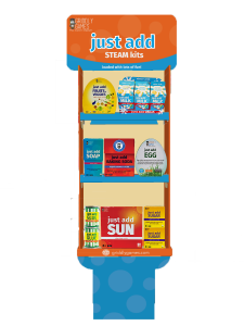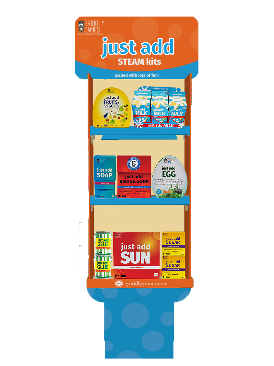 "Our STEAM line has been a big success and each year we 'Just Add' more items. With the depth of this product line, we can now show off a full display of all of the different experiment ingredients in one cool Just Add point of purchase," Reisa Schwartzman, president of Griddly Games, explains. "The STEAM term that many people refer to doesn't always connotate the surprising fun and cool things that occur when kids play with these products."