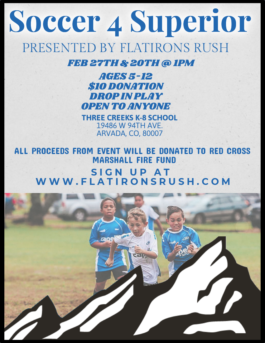 · Soccer4Superior is coming up! This is a fun event to raise funds for victims of the Marshall Fire. If interested, this is a great opportunity to give back while also getting a workout! Details below and also on our website:
