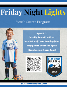 ARVADA, CO, USA, February 15, 2022 /EINPresswire.com/ -- · Friday Night Lights – Recreational League, we cannot wait to have Friday nights filled with soccer! Please make sure you register your child, if possible, by March 4th so we can adequately plan teams. The Flatirons Rush Recreational Program is an exciting, fun and energetic in-house program for players ages 5 to 12 years old! Teams will be formed based on age, location, teammate requests and coach requests. Flatirons Rush aims to foster a safe, fun, educational experience for your child as well as a solid foundation for lifetime skills. Come join the Rush family!https://www.flatironsrush.com/Default.aspx?tabid=1348800