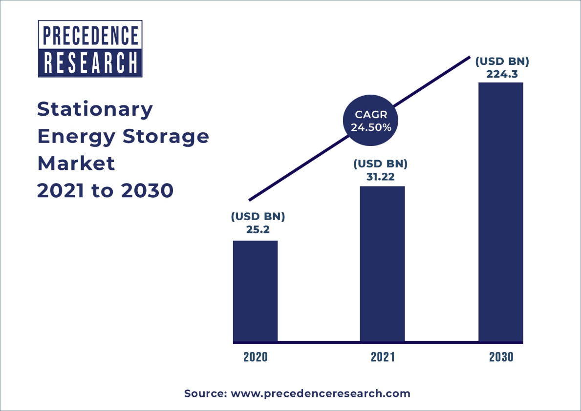 According to Precedence Research, the global stationary energy storage market size is expected to hit over US$ 224.3 billion by 2030 and is expanding growth at a compound annual growth rate (CAGR) of 24.9% from 2022 to 2030.