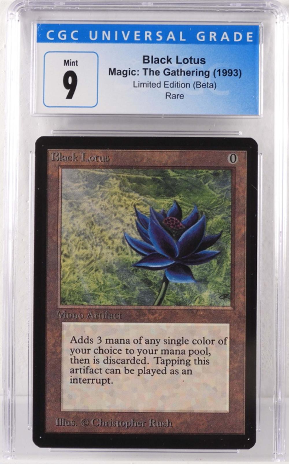 Magic: The Gathering Beta Black Lotus card, graded CGC 9 Mint, a Holy Grail item for MTG collectors and idolized for its fast mana acceleration during play (estimate: $40,000-$60,000).