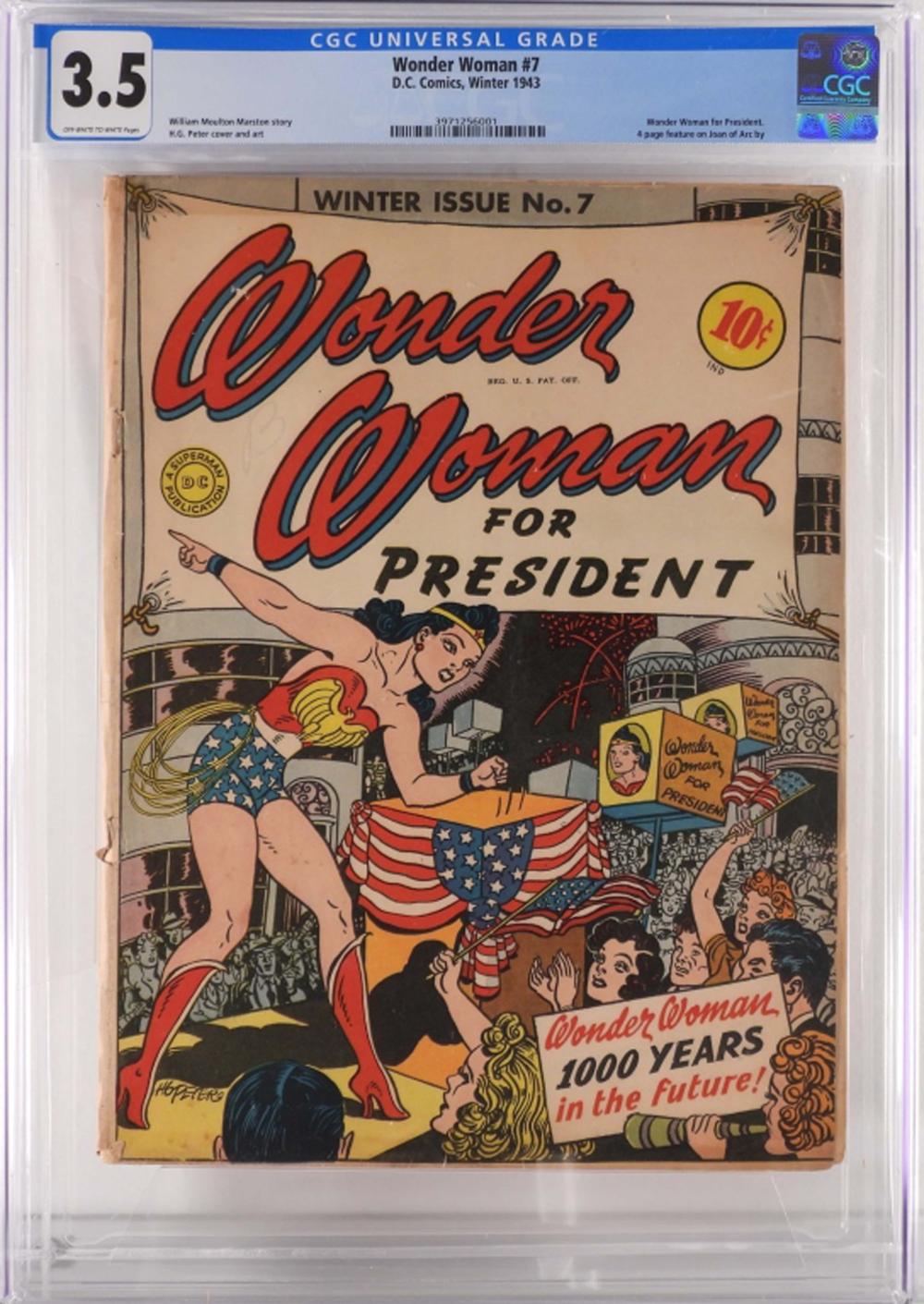 D.C. Comics copy of Wonder Woman issue #7 (Winter, 1943), featuring a “Wonder Woman for President” story and cover with art by H.G. Peter (estimate: $4,000-$6,000).