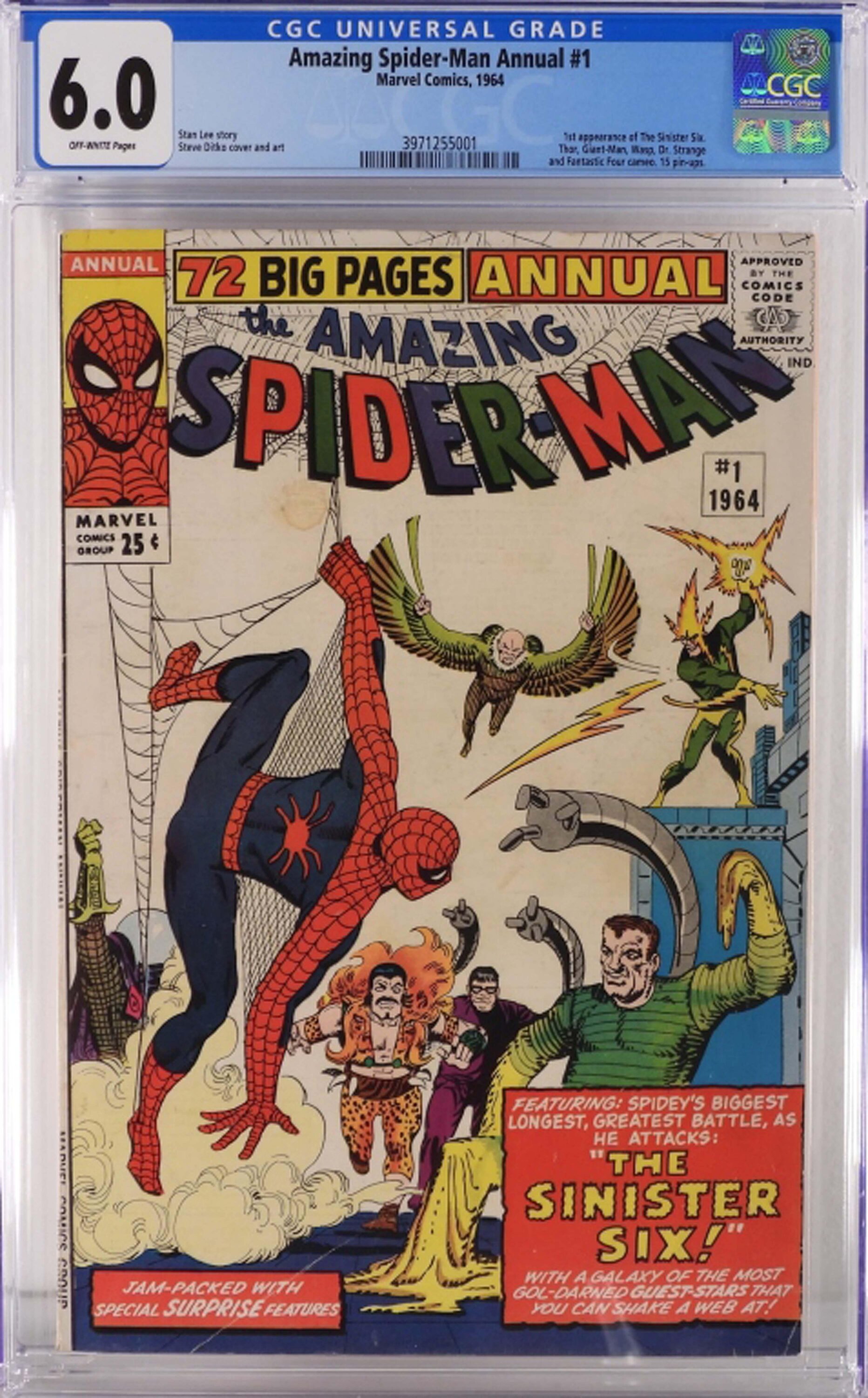 A copy of Marvel Comics Amazing Spider-Man Annual issue #1 from 1964 has a pre-sale estimate of $3,000-$4,000. The 72-page comic book features the first appearance of the Sinister Six, with appearances by Thor, Giant-Man, Wasp, Dr. Strange and the Fantastic Four. It’s graded CGC 6.0, with off-white pages. The CGC case is 13 inches by 8 inches.
