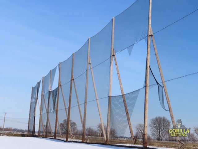 Rather than simply replacing the netting panels and moving on, Gorilla Netting removed the rotted push poles, any damaged or improperly installed hardware, and netting. The push poles were replaced with new down guy wires and anchors. The damaged and improperly installed hardware was replaced with new powerline/utility-grade hardware. The netting was replaced with new knotless polyester golf netting.