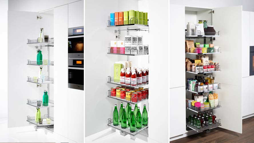 Stunning aluminum roll-up cabinet doors that can slide up with just one finger. Pull-out pantry storage that can easily be installed in a narrow space.