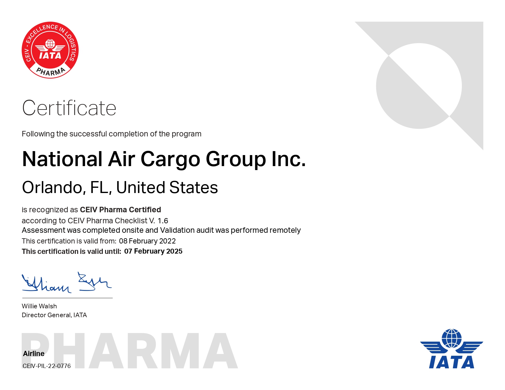 IATA developed the CEIV Pharma program to assist the global air cargo supply chain by establishing a common criteria from existing regulations and standards. National’s CEIV Pharma certification is valid through 2025.