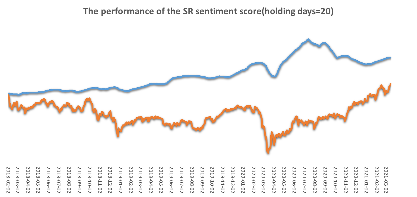 The following graph shows the performance of a portfolio with a score of 70 or more in the past year’s data (from 2018 to 2021) as long, and a portfolio with a score of 30 or less as short, measured after 20 days. As you can see from the graph, the securities report score (blue line) outperforms the TOPIX (orange line), and it is evident that this is a very effective score.