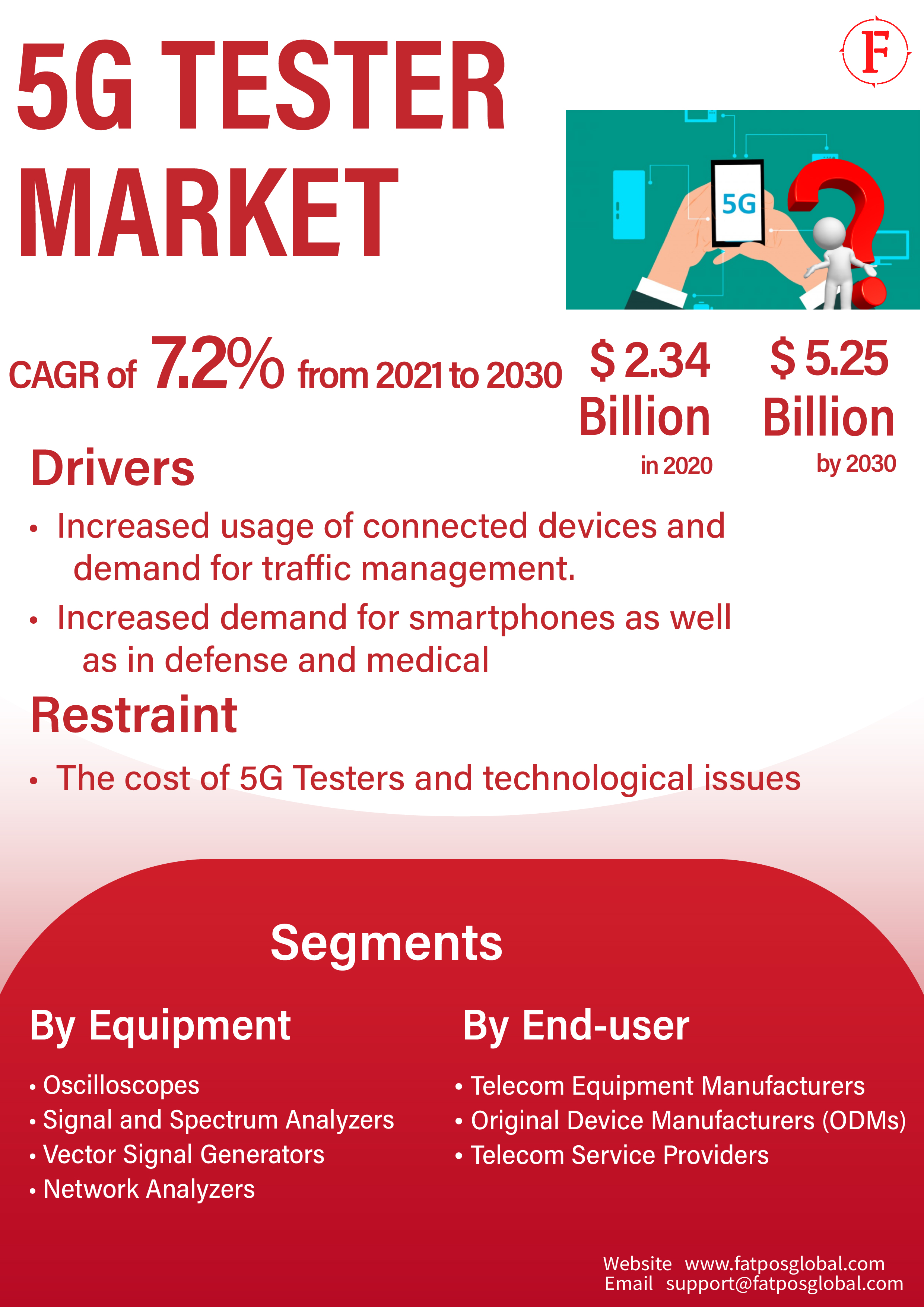 PHILADELPHIA, UNITED STATES , February 21, 2022 /EINPresswire.com/ -- Fatpos Global has released a report titled “5G Tester Market - Analysis of Market Size, Share & Trends for 2019 – 2020 and Forecasts to 2030” which is anticipated to reach USD 5.25 billion by 2030. According to a study by Fatpos Global, the market is anticipated to portray a CAGR of 7.2% between 2020 and 2030. According to the report, the rising demand for smartphones and other connected equipment with upgraded features, as well as the rising demand for a single network to enable various industries to communicate with the new technologies, are the major factors driving the market growth. The growing demand for 5G in industries such as entertainment, construction, automotive, medical, defense, and others is necessitating the use of 5G testing equipment.