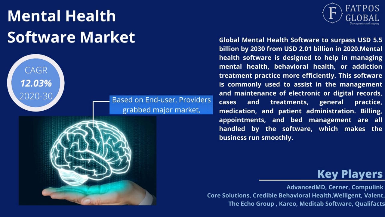 PHILADELPHIA, UNITED STATES , February 22, 2022 /EINPresswire.com/ -- Fatpos Global has released a report titled “Mental Health Software Market - Analysis of Market Size, Share & Trends for 2019 – 2020 and Forecasts to 2030” which is anticipated to reach USD 5.5 billion by 2030. According to a study by Fatpos Global, the market is anticipated to portray a CAGR of 12.03% between 2020 and 2030. According to the report, factors such as the surge in adoption of mental health software, increasing government funding and initiatives to promote EHR adoption in behavioral health organizations, favorable behavioral health reforms in the US, and high demand for mental health services amidst provider scarcity are driving the growth of global market.