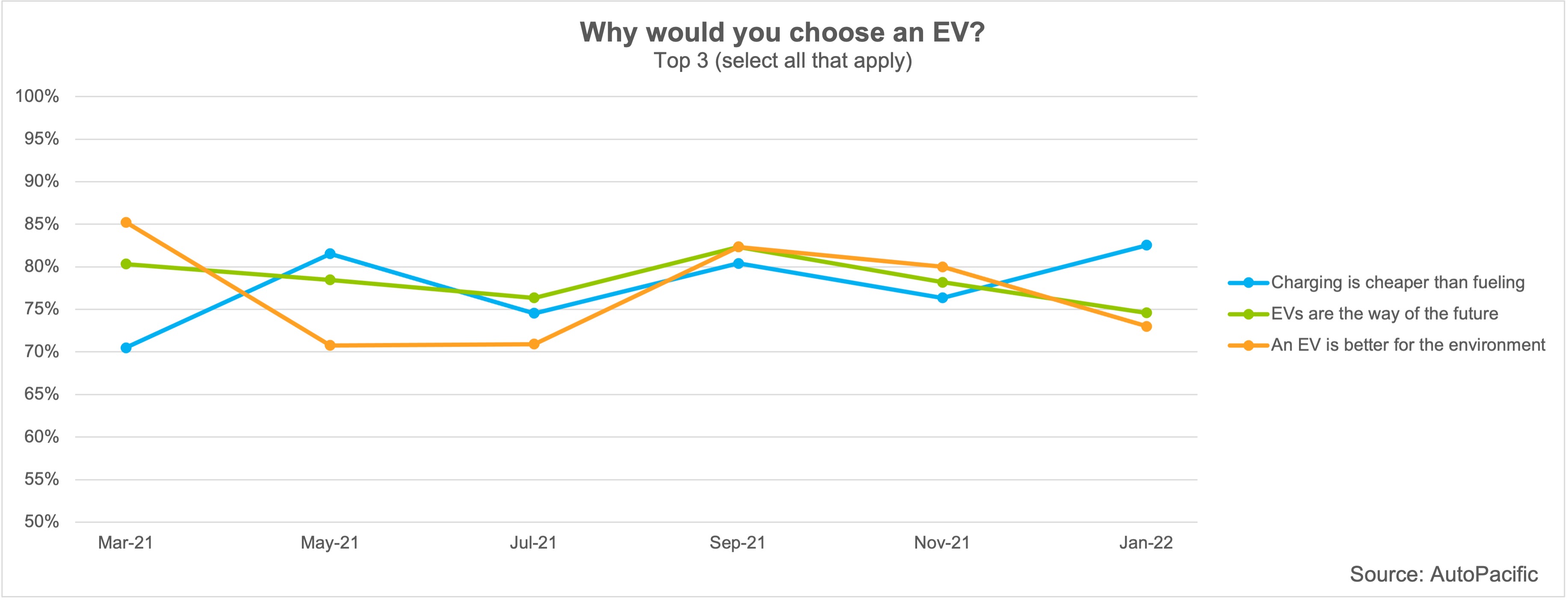 Since March of 2021, when AutoPacific began asking EV intenders why they would choose an EV, the top three reasons have consistently been “charging is cheaper than fueling,” “an EV is better for the environment,” and “EVs are the way of the future.” Consumers also like the convenience of charging and the quietness of an EV. “EVs are establishing their place in the market by providing consumers with more than just efficiency compared to traditional internal combustion vehicles,” says Kim.