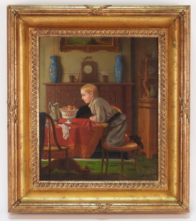 The painting by Carlin showed a young boy kneeling on a cane chair, with elbows on the table, staring at a footed center bowl full of apples. The work, 12 inches by 10 inches (canvas, less frame), was signed “J. Carlin” lower right. Carlin, who was born deaf and was also an accomplished poet, studied art in Philadelphia as well as London and France.