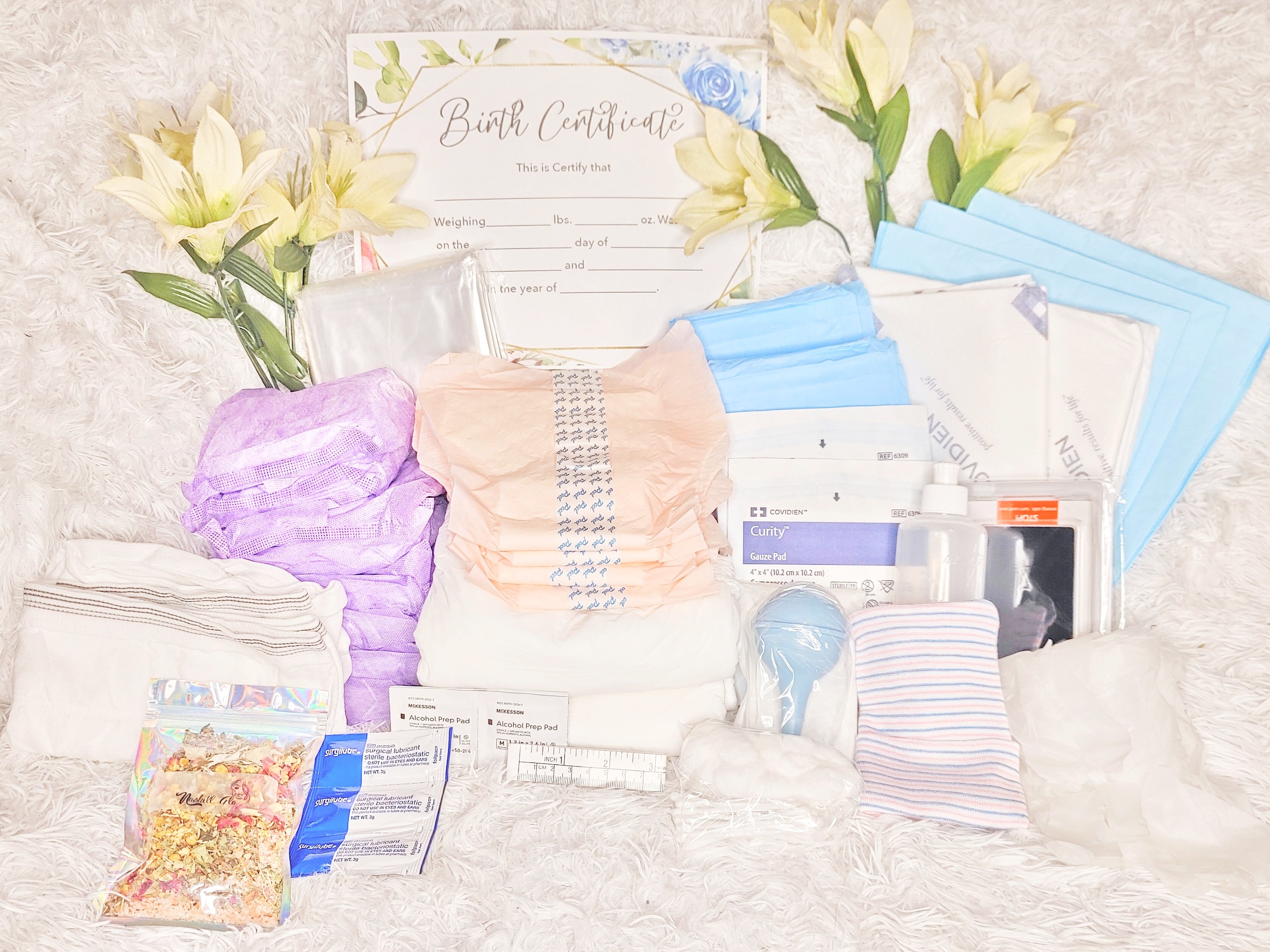 This kit contains everything that the expectant mom needs for the delivery of her new little one, such as mesh panty-stretch brief, latex gloves, lubricant jelly, diapers, infant hat, and a commemorative birth certificate to celebrate the newborn and many more items.