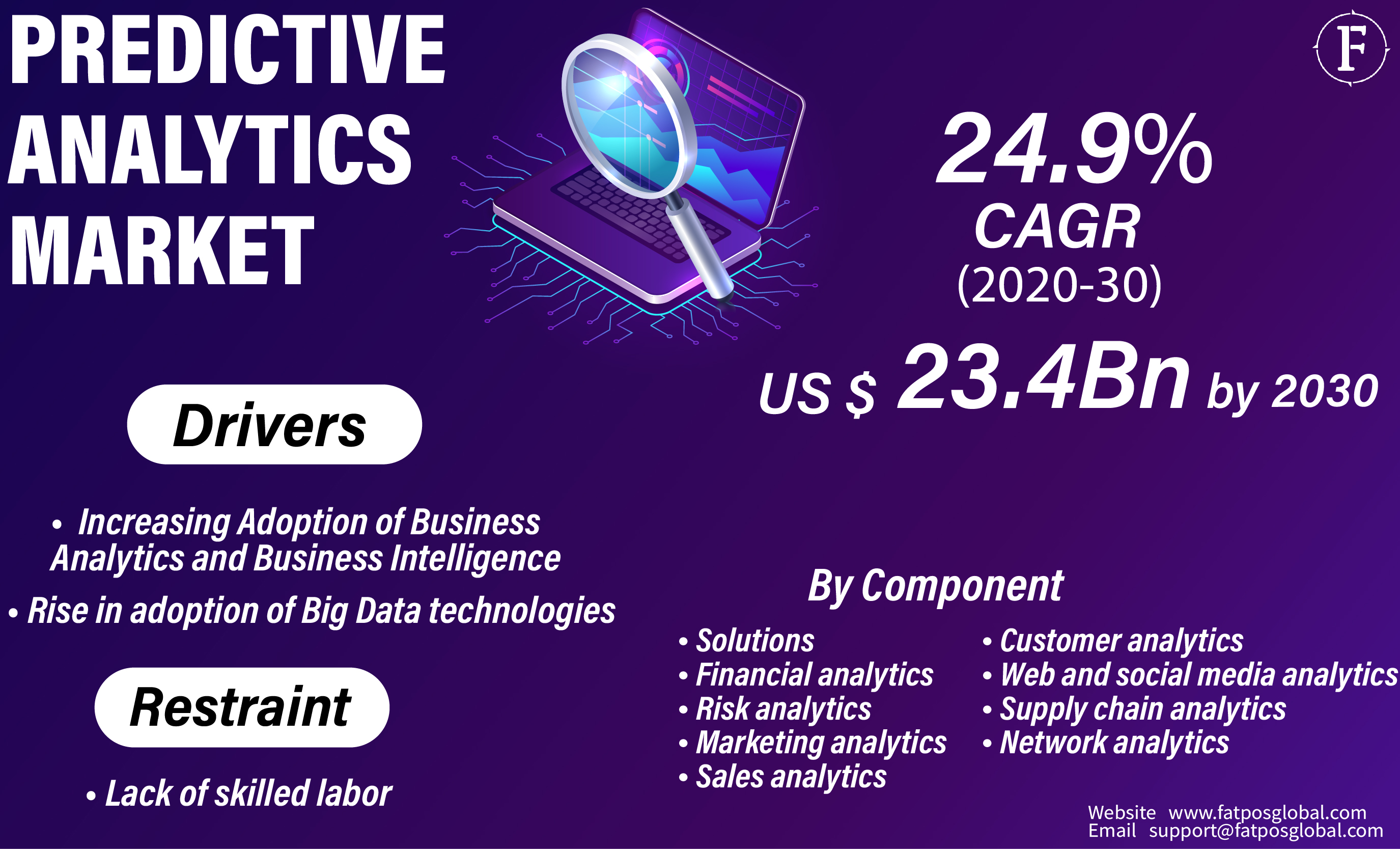 PHILADELPHIA, UNITED STATES , February 28, 2022 /EINPresswire.com/ -- Fatpos Global has released a report titled “Predictive Analytics Market - Analysis of Market Size, Share & Trends for 2014 – 2018 and Forecasts to 2030” which is anticipated to reach USD 23.4 billion by 2030. According to a study by Fatpos Global, the Market is expected to grow at a CAGR of 24.9% throughout the forecast period, i.e., 2019-30. The increase in performance, the reduced risks expected to be taken due to the ability to make more well-informed decisions with the aid of predictive analytics, and the improvement in customer enhancement are factors that have a positive effect on the market. The rapid developments in technology, the boom in artificial intelligence, and the high level of competition have led to this market's growth. The other drivers for the rapid growth of markets for predictive analysis include increased organizational use of Big Data and cloud and an increasing need for product differentiation that drives the launch and adoption of new technologies.